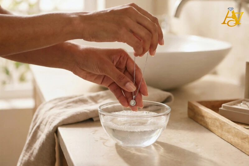- Prepare the Solution: Pop your diamond jewellery into a small bowl of warm water and add a tiny bit of mild, non-detergent soap (like dish soap).Â