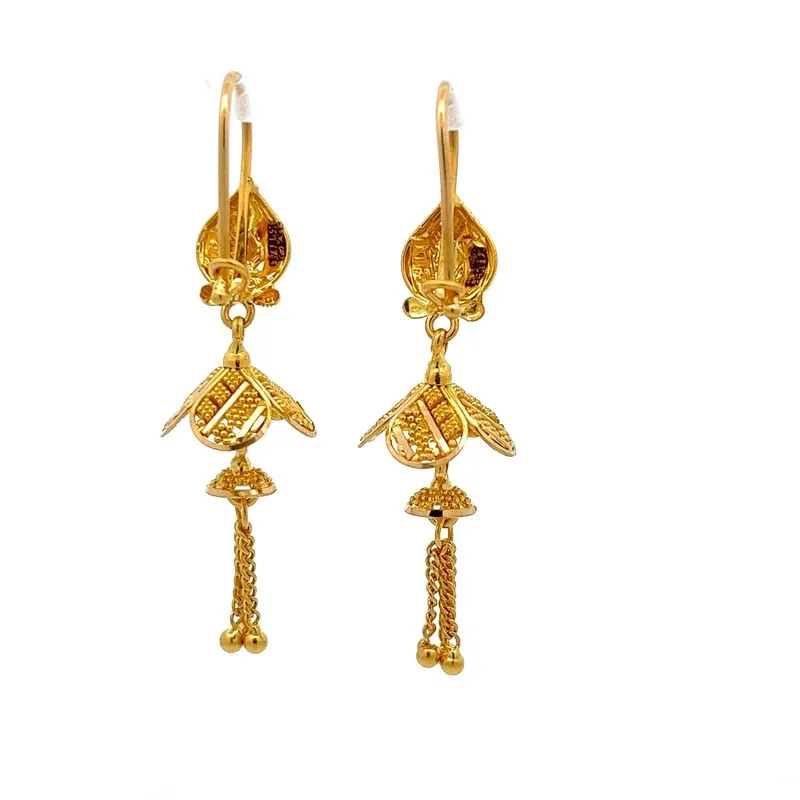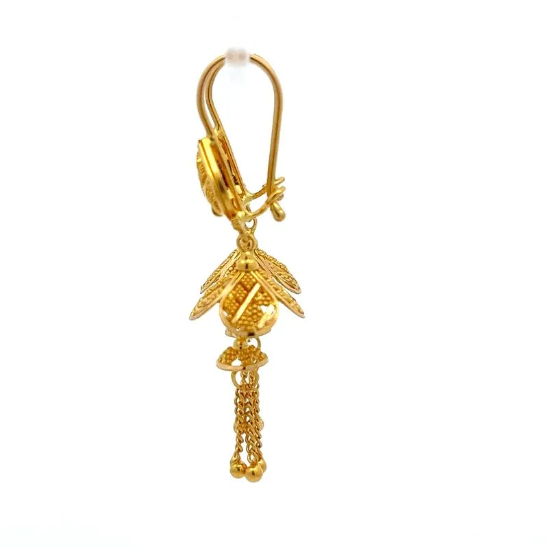 Adorn yourself with the enchanting charm of Blossom Bells Jhumka Earrings. These gold jhumka earrings feature petal bells in a delicate floral design, capturing the essence of elegance and grace.